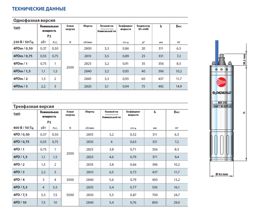 Погружной двигатель для скважинного насоса Pedrollo 4PD предназначен для соединения с гидравлической частью скважинных насосов Pedrollo. Благодаря высокому КПД и надежности двигатель для скважинного насоса Pedrollo 4PD применяется в быту и в промышленности.Двигатель Pedrollo 4PD применяется совместно с гидравлической частью для: