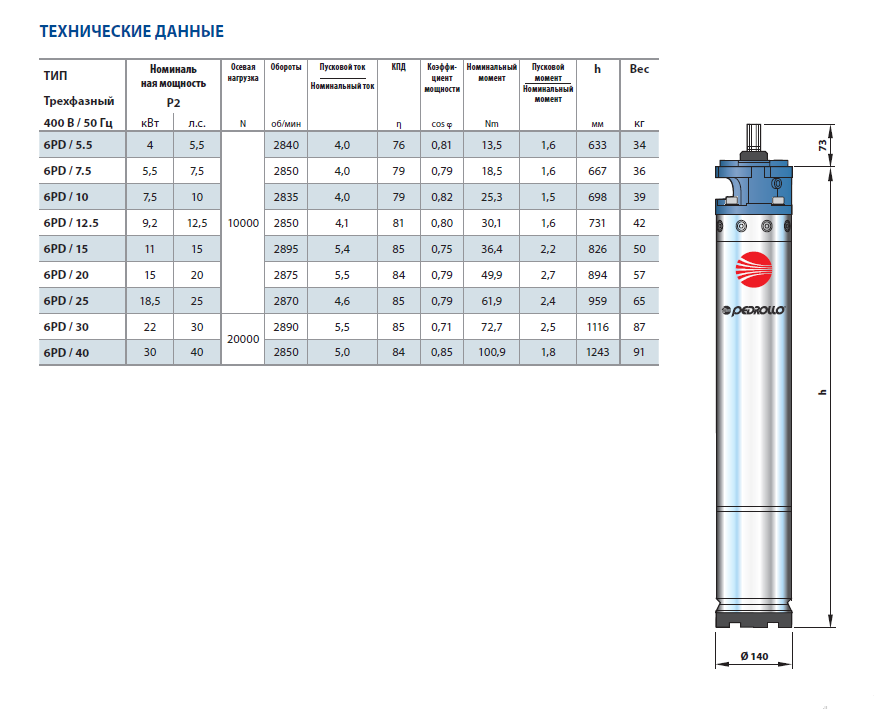 Погружной двигатель для скважинного насоса Pedrollo 6PD предназначен для соединения с гидравлической частью скважинных насосов Pedrollo. Благодаря высокому КПД и надежности двигатель для скважинного насоса Pedrollo 6PD применяется в быту и в промышленности.