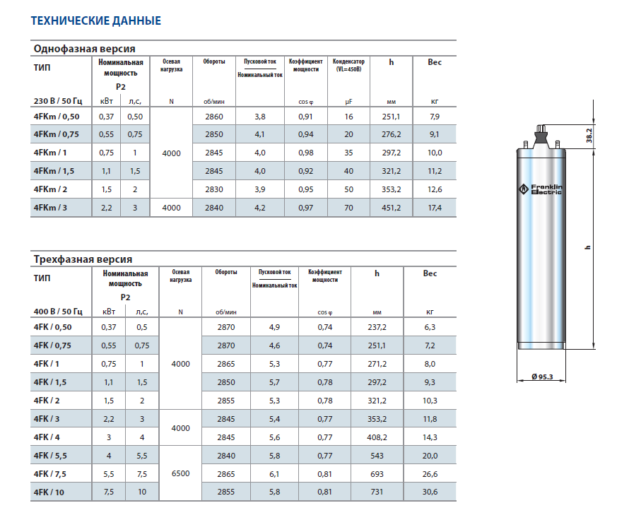 Погружной двигатель Franklin Electric 4FK спроектирован по американскому типу, обмотки капсулированы с помощью смолы и нержавейки AISI 316. В пустотах между статором и ротором залита глицериновая жидкость.
