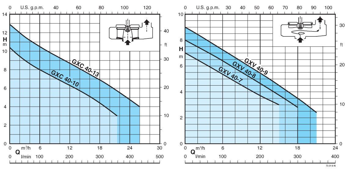 - Для жидкостей, содержащих твердые инородные тела и длинные волокнистые частицы наиболее подходит модель GXV с осаженным рабочим колесом.