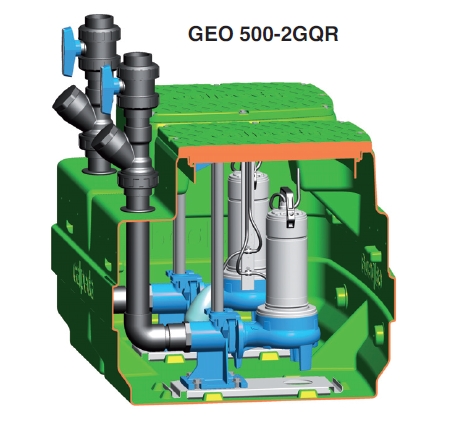 Автоматическая станция сбора и подъема сточных вод с насосами серии GQR. Бак из полиэтилена средней плотности, устойчивый к коррозии, с минимальными габаритными размерами. Двойной бак GEO 500 с номинальной емкостью 500 литров для установки двух электронасосов. Два варианта установки: на уровне земли или под землей. Для подземной установки можно использовать расширения (максимум два расширения). Легкий доступ к насосу через крышку, закрепленную винтами. GQR - погружной дренажный насос с открытым рабочим колесом и горизонтальным напорным отверстием.Область применения