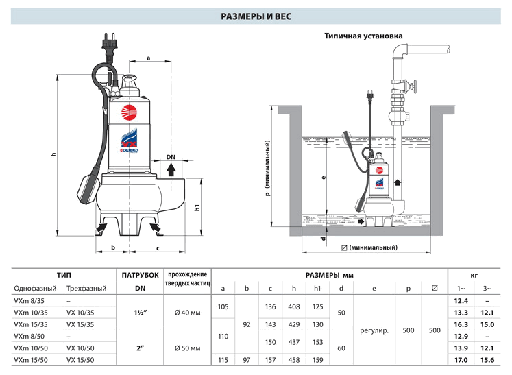 Погружной фекальный дренажный насос Pedrollo VX 10/35 с рабочим колесом Vortex