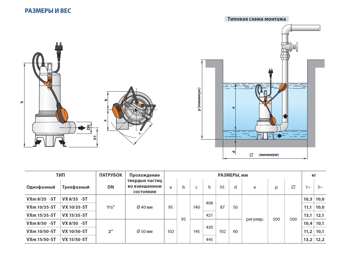 - до 50 мм для VX/50-ST - Минимальный уровень погружения при непрерывном режиме работы: