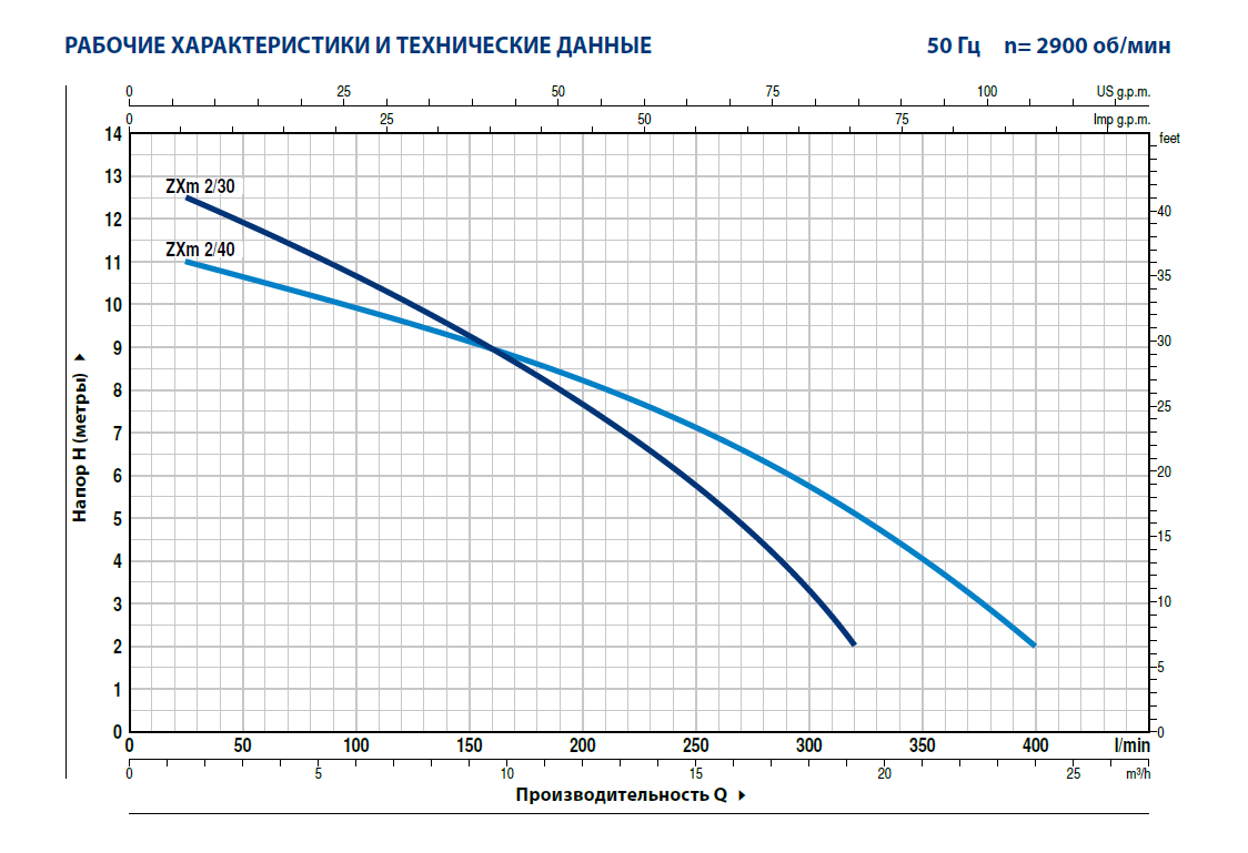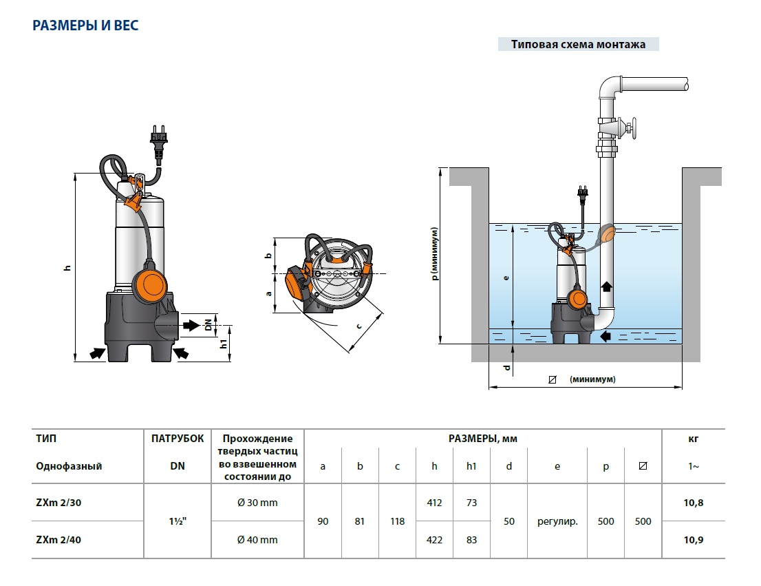 - до 40 мм для ZXm 2/40 - Минимальный уровень погружения при непрерывном режиме работы:
