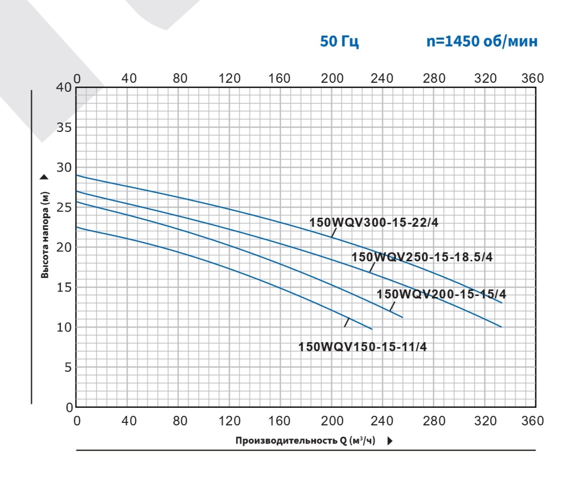 Мощность насоса Purity 150WQV250-15-18.5/4 составляет 18.5 кВт, а напряжение - 380В. Насос обеспечивает напор 15 м, производительность 250 м³/ч.