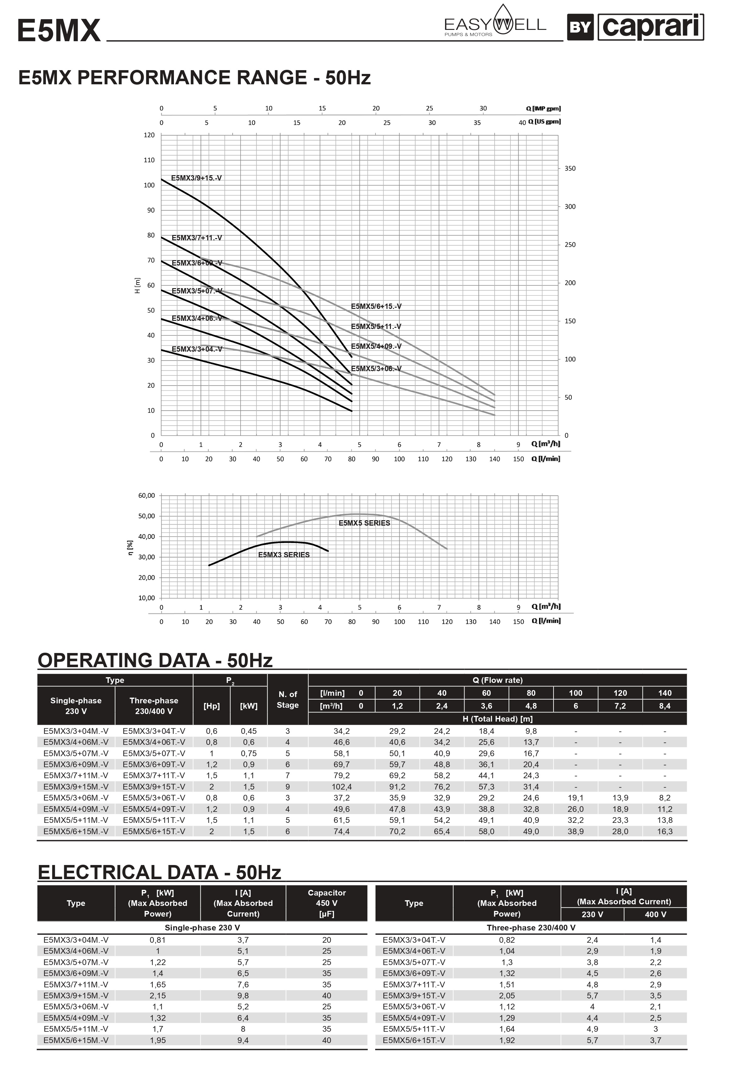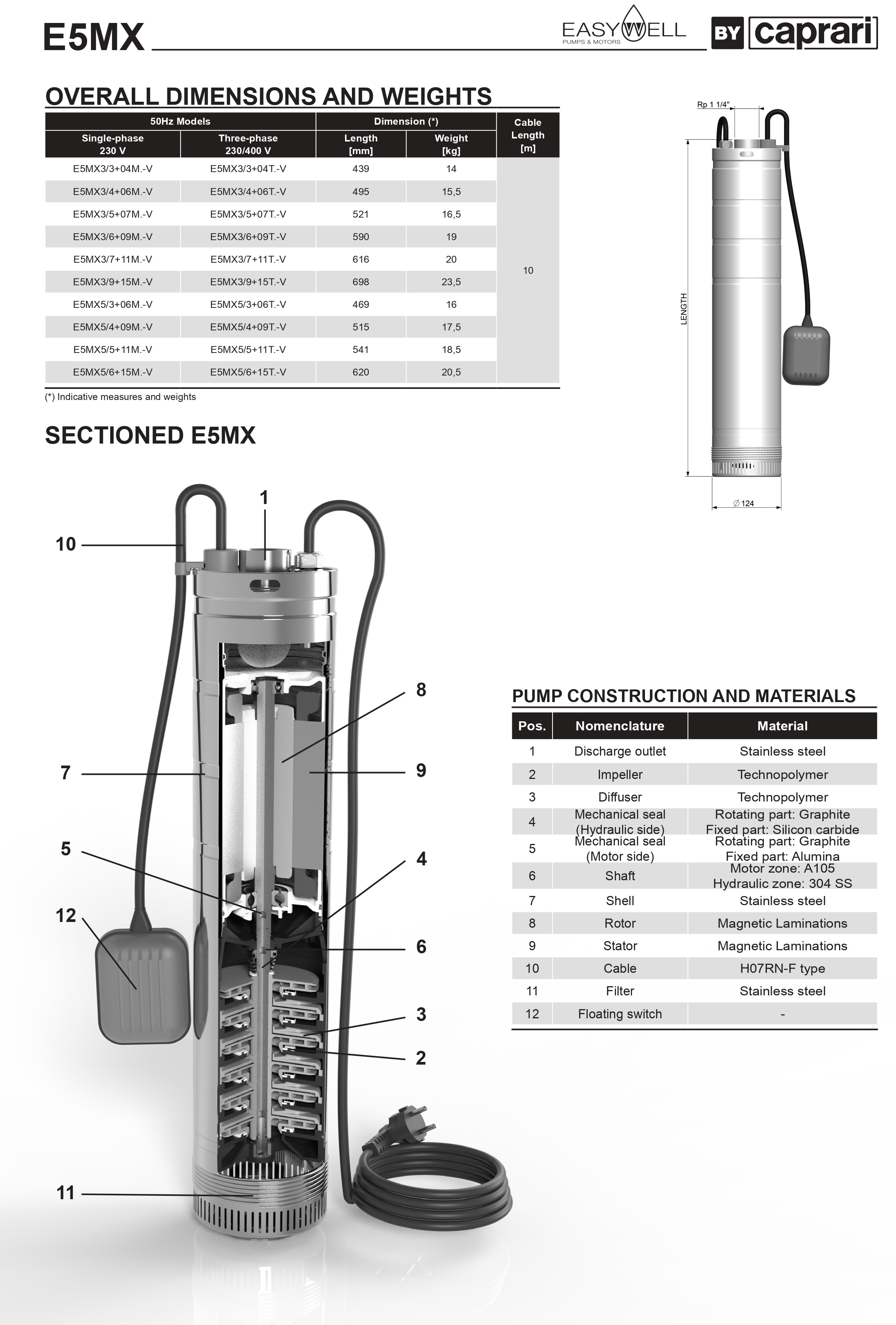Скважинные 5-дюймовые насосы Caprari семейства EASYWELL из нержавеющей стали c рабочим колесом из технополимера делают E5MX устойчивым к коррозии и песку.Встроенный электродвигатель защищен двойным механическим уплотнением, гарантирующим долговечность. Однофазные и трехфазные версии с внутренними и внешними конденсаторами обеспечивают высокую гибкость использования.