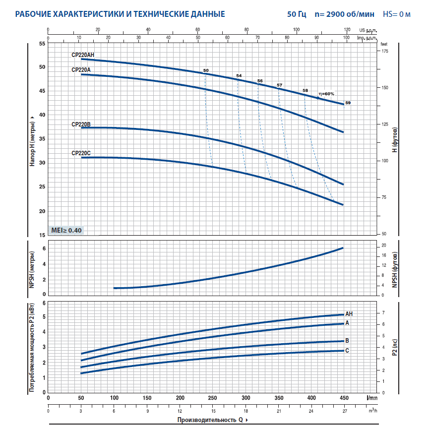 Центробежный насос Pedrollo CP 220AH – это моноблочный одноступенчатый насос с резьбовыми патрубками. Он позволяет перекачивать воду и прочие неагрессивные к чугуну жидкости, применяется в системах водоснабжения и отопления. Производительность насоса колеблется от 3,0 до 27,0 м3/час (от 50 до 450 л/мин), а напор соответственно от 42,0 до 51,5 м.в.ст. При этом, оптимальная рабочая точка производительности 24,0 м3/ч (400 л/мин) при давлении 44,0 м.в.ст. КПД насоса в указанной точке составляет около 60 %. Насос CP 220AH оснащен асинхронным трехфазным двигателем 380/220 В (50 Гц), 2900 об/мин (2Р), мощностью 4,0 кВт.Область применения