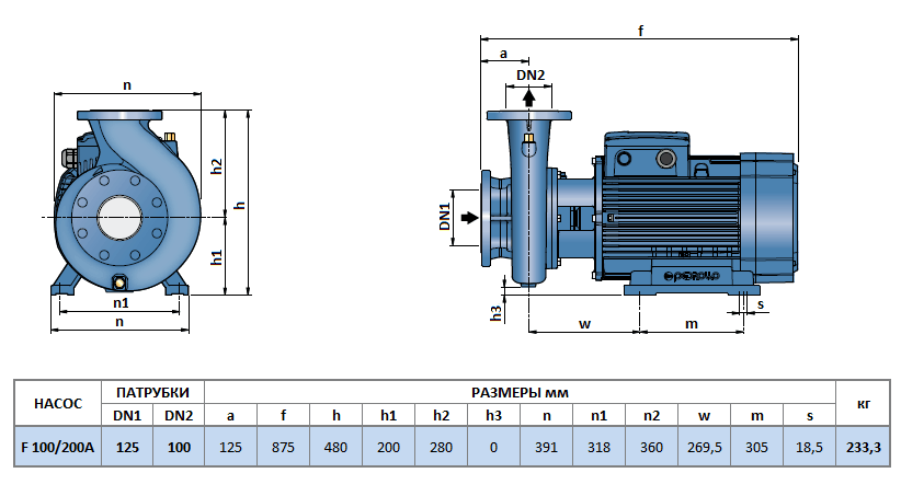 Центробежный насос Pedrollo F 100/200A – это консольно-моноблочный насос с фланцевыми патрубками. Насос перекачивает чистую и слегка загрязненную воду и неагрессивные к чугуну жидкости. Используется для решения задач водоснабжения, орошения, циркуляции. Применяется в промышленности и коммунальной сфере, в сельском хозяйстве и в установках тушения пожаров. Насос производится на заводе Pedrollo в Италии. Производительность насоса от 50 до 315 м3/час (833 - 5250 л/мин), напор от 38 до 63 м.в.ст. Рабочая точка производительности 250 м3/ч (4167 л/мин) при напоре 51 м.в.ст. КПД насоса в указанной точке около 81 %. Диаметр напорного патрубка 100 мм, всасывающего 125 мм. Электроприводом насоса служит асинхронный трехфазный двигатель 380 В - 50 Гц, 2900 об/мин - 2Р, мощностью 45 кВт.Область применения