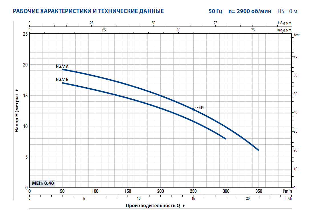 Производительность модели 3 - 21 м3/ч, что составляет 50 - 350 л/мин, напор до 19,5 м. Рабочая точка 15 м3/ч при напоре 12,5 м. КПД в указанной точке 65 %. Двигатель мощностью 0,75 кВт, 1Ф~, 220 В (50 Гц), номинальная скорость 2900 об/мин (2Р).