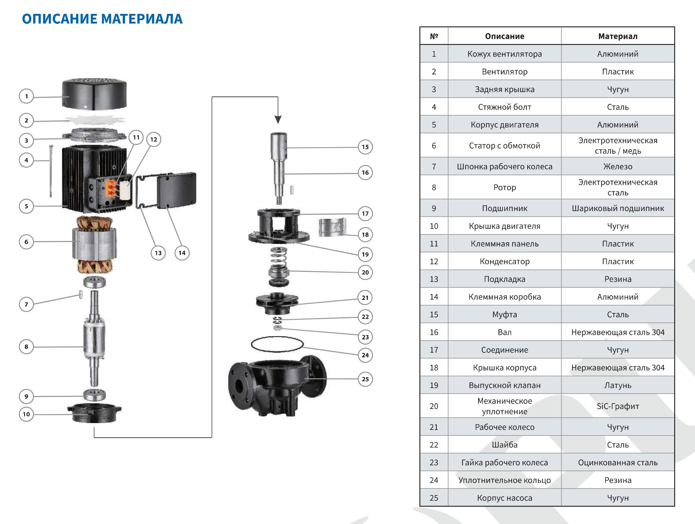 Корпус насоса и рабочее колесо изготовлены из чугуна, что обеспечивает прочность и устойчивость к образованию коррозии.