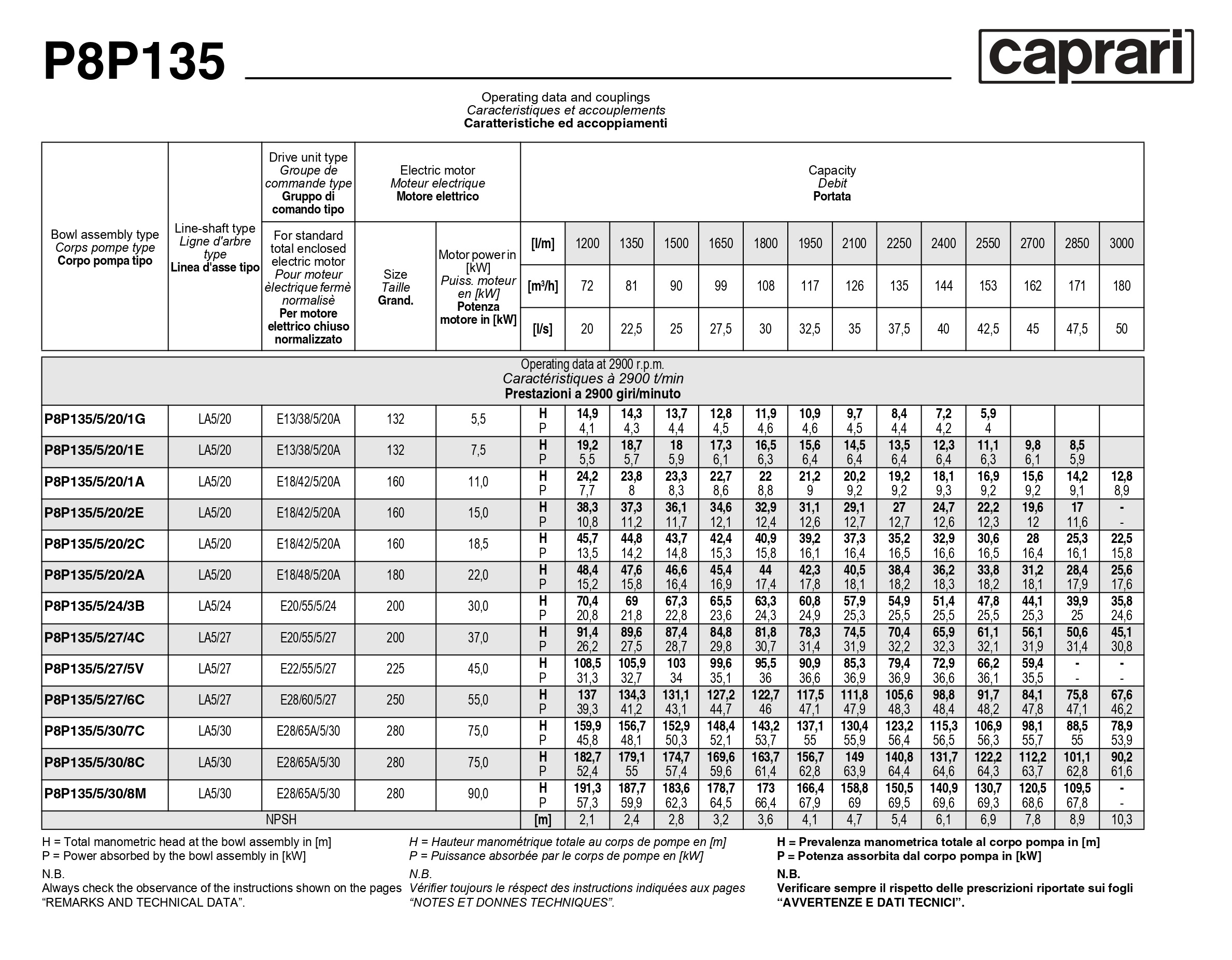 Вертикальные полупогружные насосы Caprari серии P с линейной колонной стандартной конструкции в настоящее время могут быть погружены глубоко под землю до горизонта грунтовых вод. Установка насоса в скважины глубиной до 120 м, считается обычной на сегодняшний день. Также многие специально сконструированные насосы устанавливаются глубже 250 м. Конфигурация с погружным насосом, линейным валом и поверхностным приводом - это надежное решение с высокой эффективностью. Насосы серии P доступны в различных металлургических производствах и могут управляться как электрическими, так и эндотермическими двигателями, что гарантирует широкую гибкость при использовании в скважинах и резервуарах. Подходят для ирригации, водоснабжения, промышленности и систем пожаротушения.Область применения