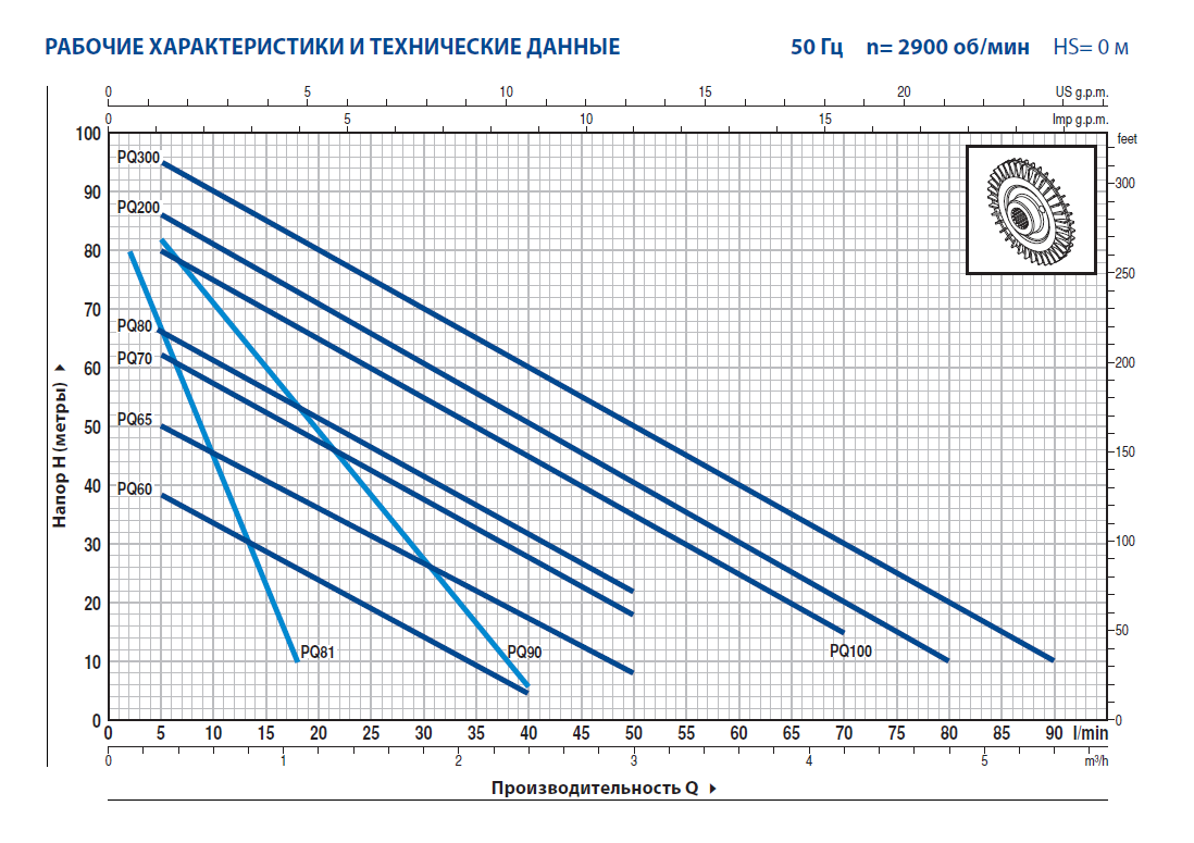 - Максимальное давление в корпусе насоса: 6 бар в PQ 60-65; 10 бар в PQ 70-80-81-90-100-200-300